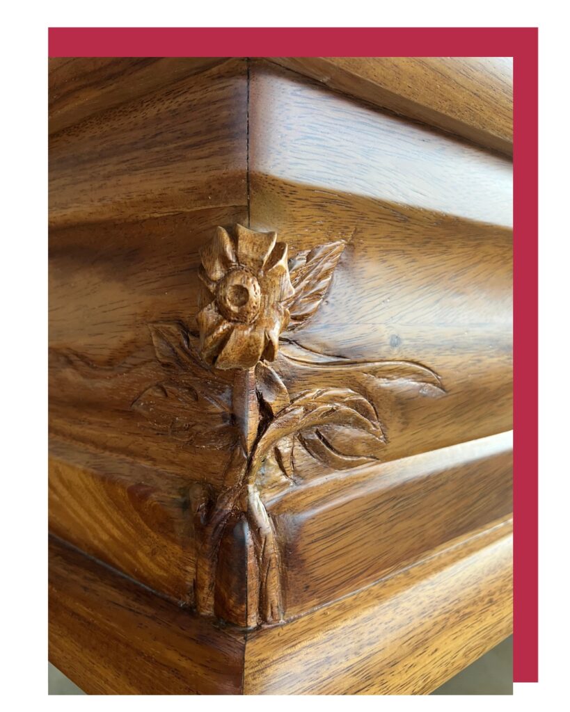 L’eleganza prende forma nel legno pregiato di Bahia, valorizzato da una sponda da 31 cm e da raffinati intagli floreali realizzati a mano.